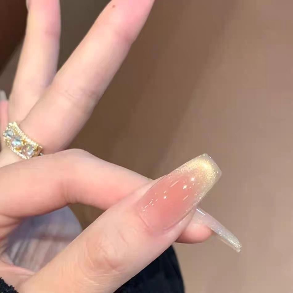 形はショートバレリーナ型で、手元を美しく見せつつ、どんなシーンでも自信を持ってご使用いただけます。ゴールドのグラデーションとジュエリーの輝きが、あなたの指先を魅力的に彩ります。