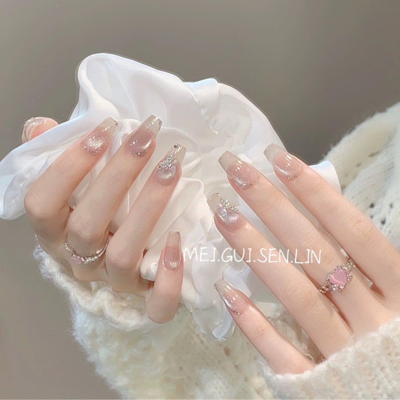 【数量限定】シルバーグレージュ×蝶々ビジューの上品ネイルチップ〔yn002〕