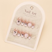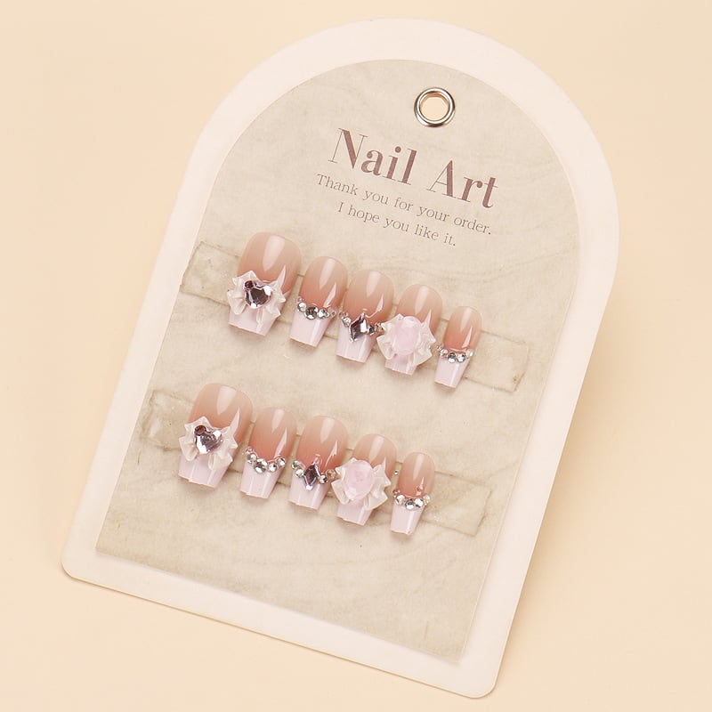 エレガントなピンクの色合いに、華やかなビジューと可愛らしいリボンを組み合わせた人気デザインのネイルチップ。光を受ける度に指先に煌めきを与え、柔らかな印象と女性らしさを引き立てます。