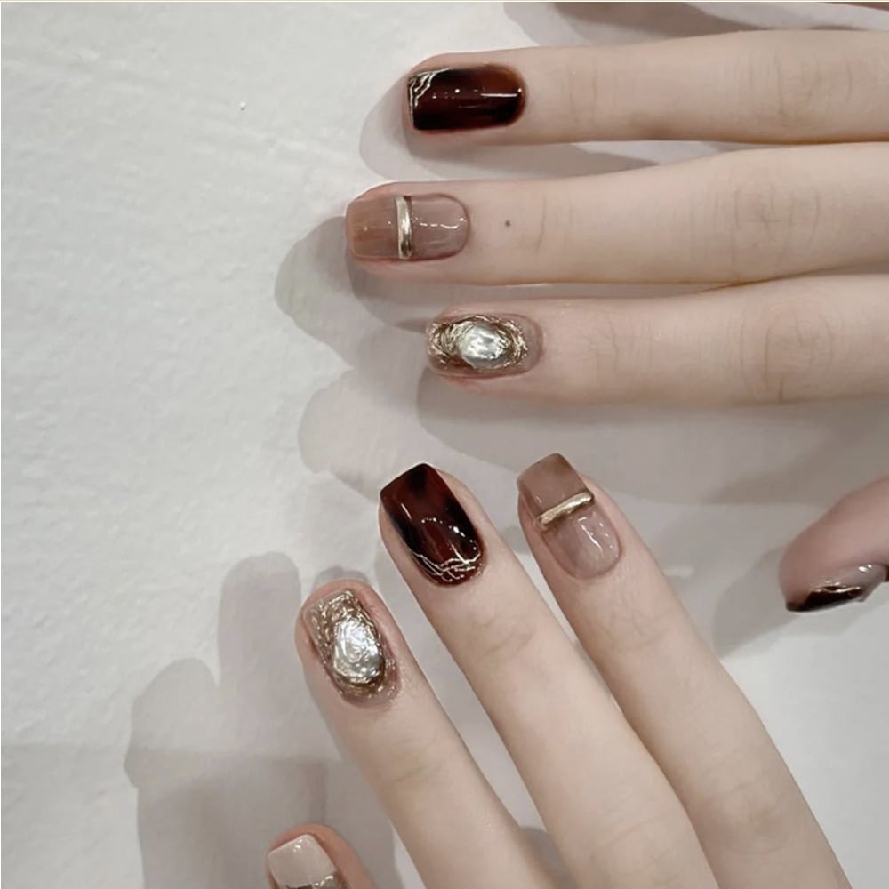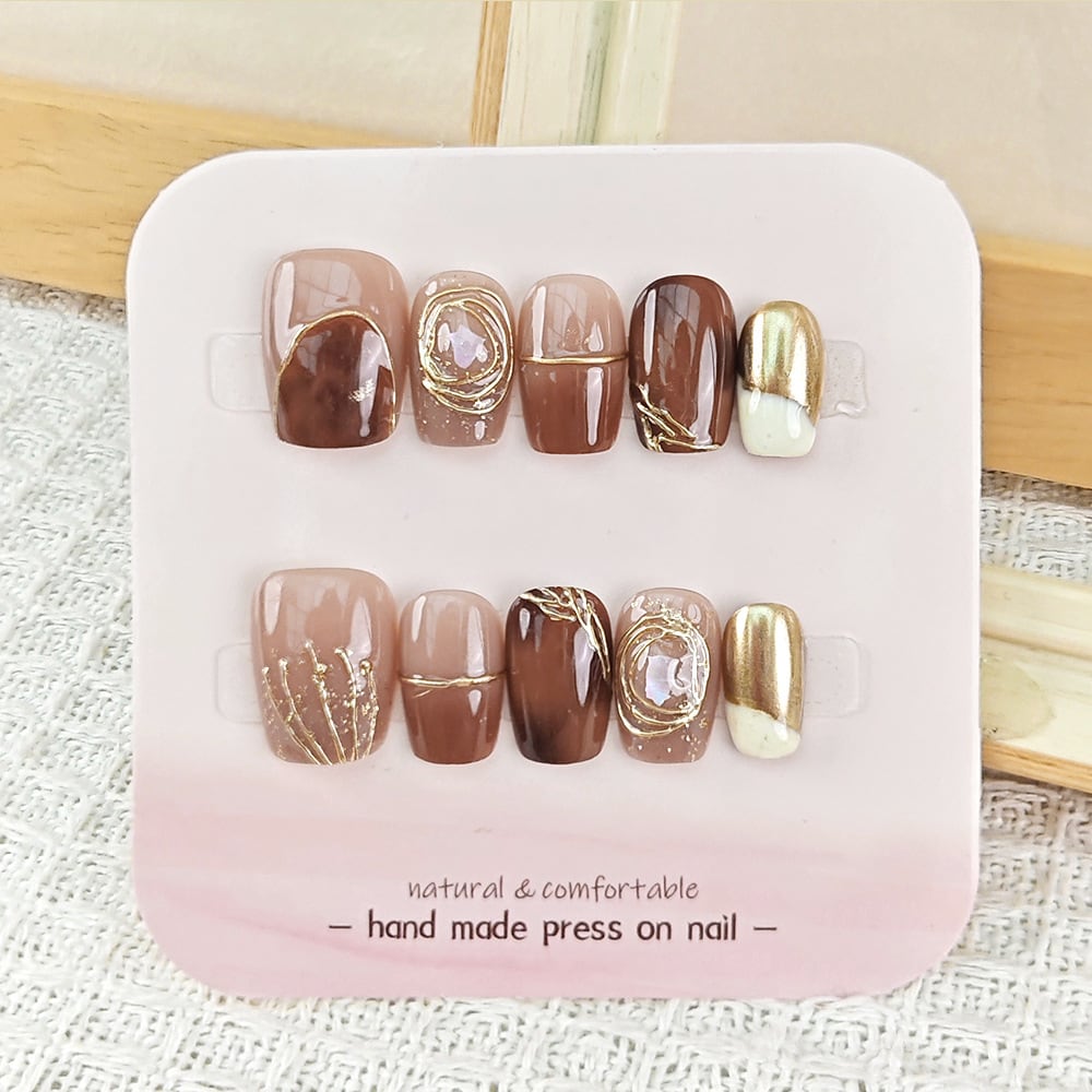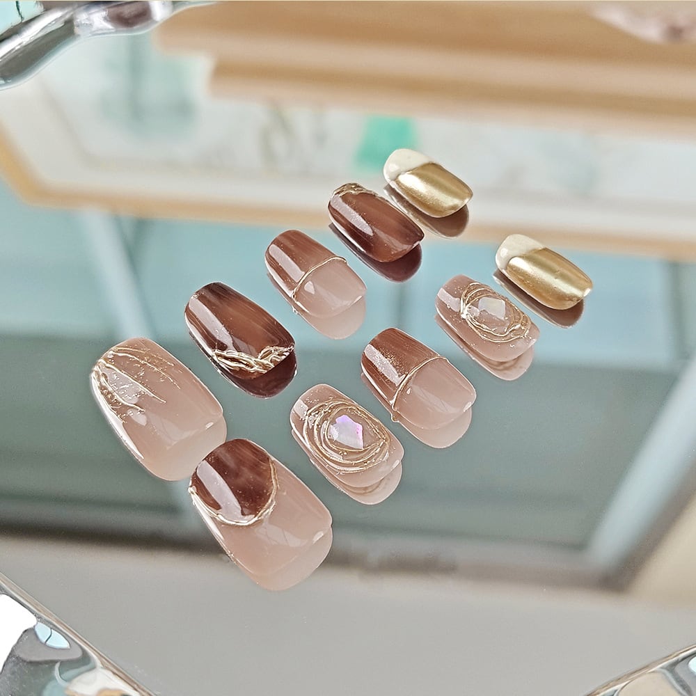 エレガントで魅力的な雰囲気を纏った、【限定入荷】マーブルブラウン×ゴールドミラーのネイルチップが登場!美しいマーブルブラウンに輝くゴールドミラーが絶妙に調和し、指先に上品さと高級感を与えます。
