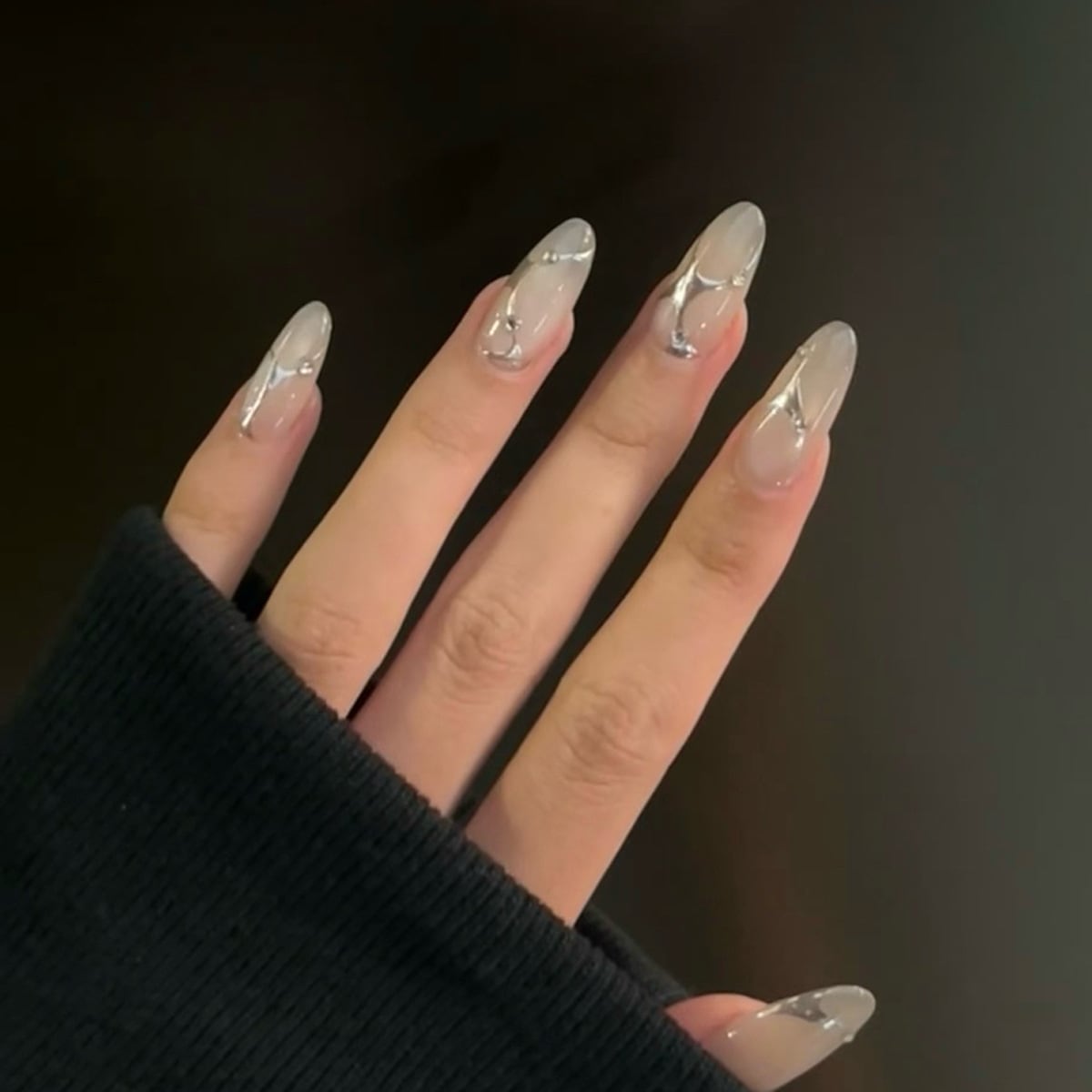 エレガントで洗練された雰囲気を纏った、【人気】うる艶×シルバーラインのクリアニュアンスネイルチップが登場!美しいクリアニュアンスに輝くシルバーラインが絶妙に調和し、指先に上品さと魅力をプラスします。