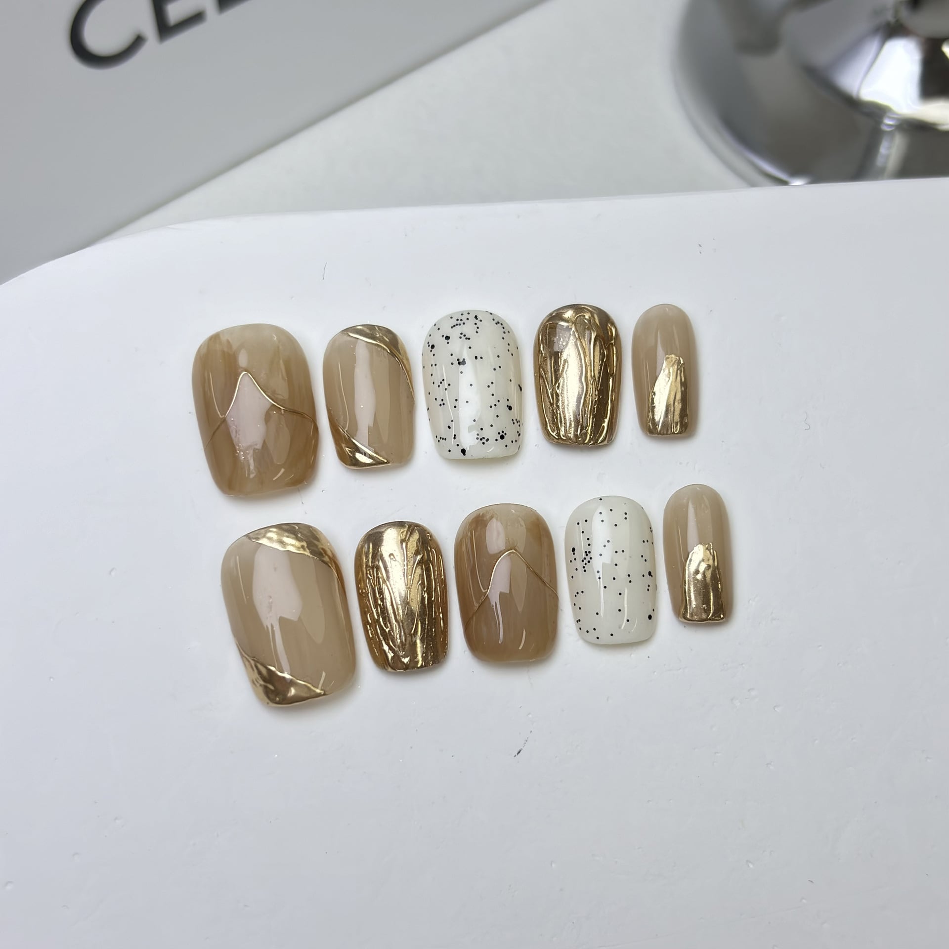 【新入荷】カフェベージュ×ゴールドミラーの大人ニュアンスネイルチップ〔yn022〕