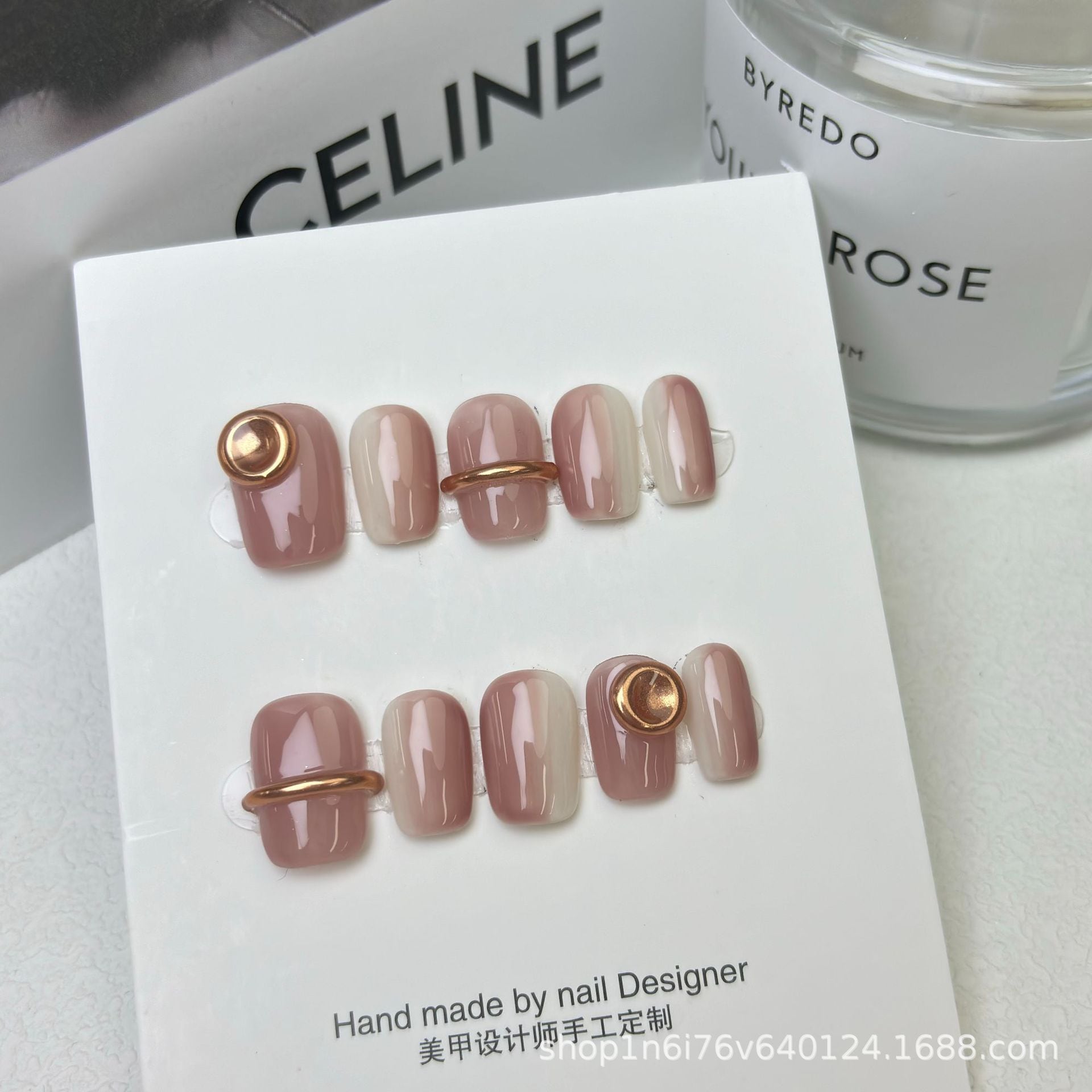 【新入荷】くすみピンク×ゴールドリングの韓国風ネイルチップ 〔yn021〕